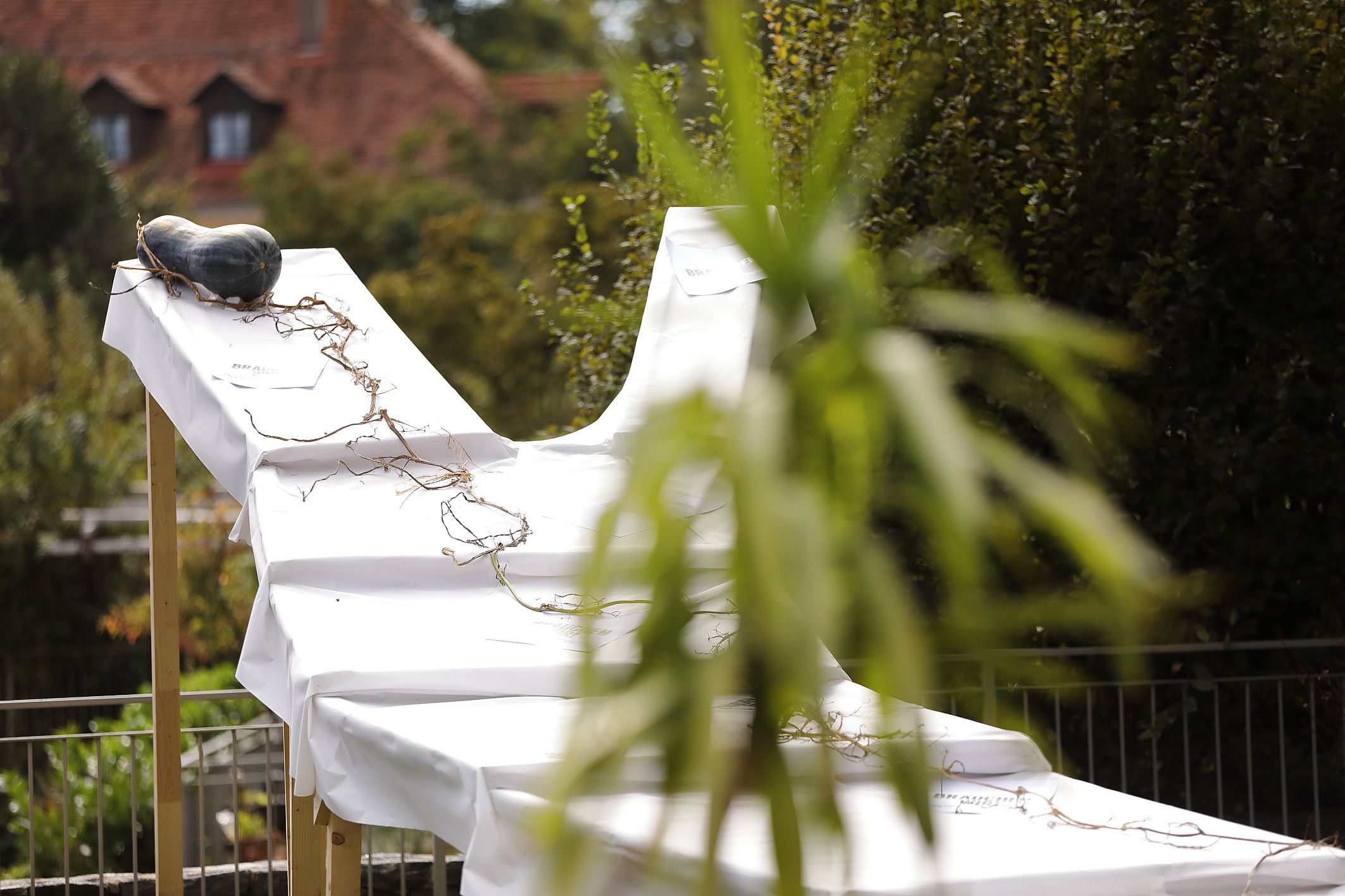 Die Künstler Markus Hiesleitner und Franz Tišek öffnen den Gartenpavillon des Volkskundemuseums und rücken ihn als „Offenen Pavillon“ ins Zentrum des Markts der Zukunft 2025. Mit den Fenster- und Türläden des Pavillons bauen sie eine skulpturale Tafel, die zu einem lebendigen Ort für Gespräche und Austausch wird. Die Initiative Vorsicht, Gemüse! richtet dort eine Gemeinschaftsküche ein und verarbeitet essbare Gartengewächse aller Art, vom Stengl bis zum Butzn. Gemüse, Wasser, Salz und Zeit sind dabei die Zutaten der Suspekten Fermenteküche. Sie dient dem Vorglühen und als Gemüsebühne für den Kürbis-Tanz: die rituelle Teilung und Verarbeitung eines Langen von Neapel. Die architektonische Intervention von Hiesleitner und Tišek ist zudem Träger für eine Collage, bestehend aus Bannern, Flyern und Plakaten, die in den letzten Monaten bei Veranstaltungen und Demonstrationen der Kooperationspartner:innen im Einsatz waren.